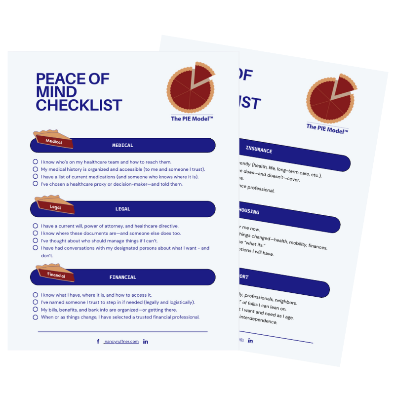 Download the Peace of Mind Checklist (Professional Edition) for your first taste of The PIE Model™ — six essential areas of life where things can go sideways if no one’s paying attention.